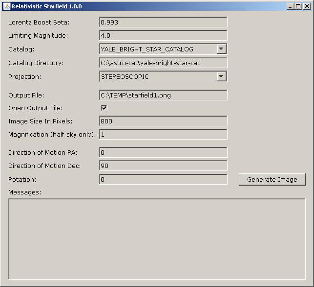 But for a more realistic result, closer to what you would actually see, you need to use more stars - many more stars, even millions. Since an animation using that many stars would not work well in a typical browser, a small desktop application (implemented in the Java programming language, version 1.7.0) has been created for generating such images from large star catalogs. The software is simple, and consists of a single dialog, where you input various parameters, and then generate a single image file. No animation is created, just a single image file. (With the number of stars in the millions, it can take several minutes to generate a single image.)